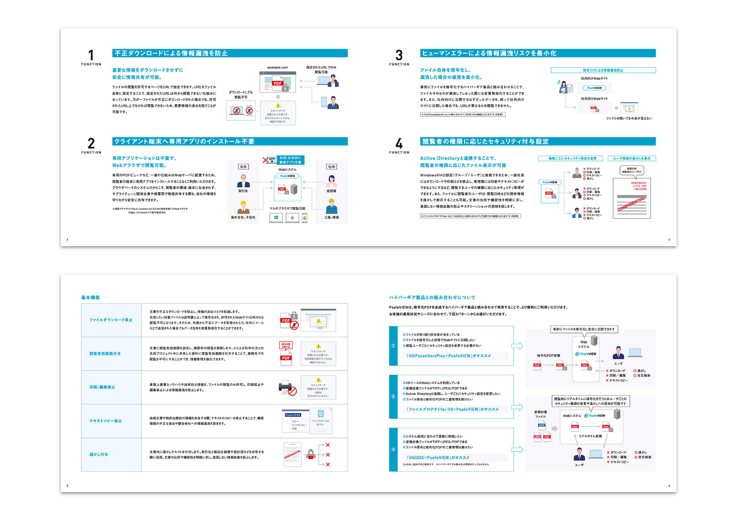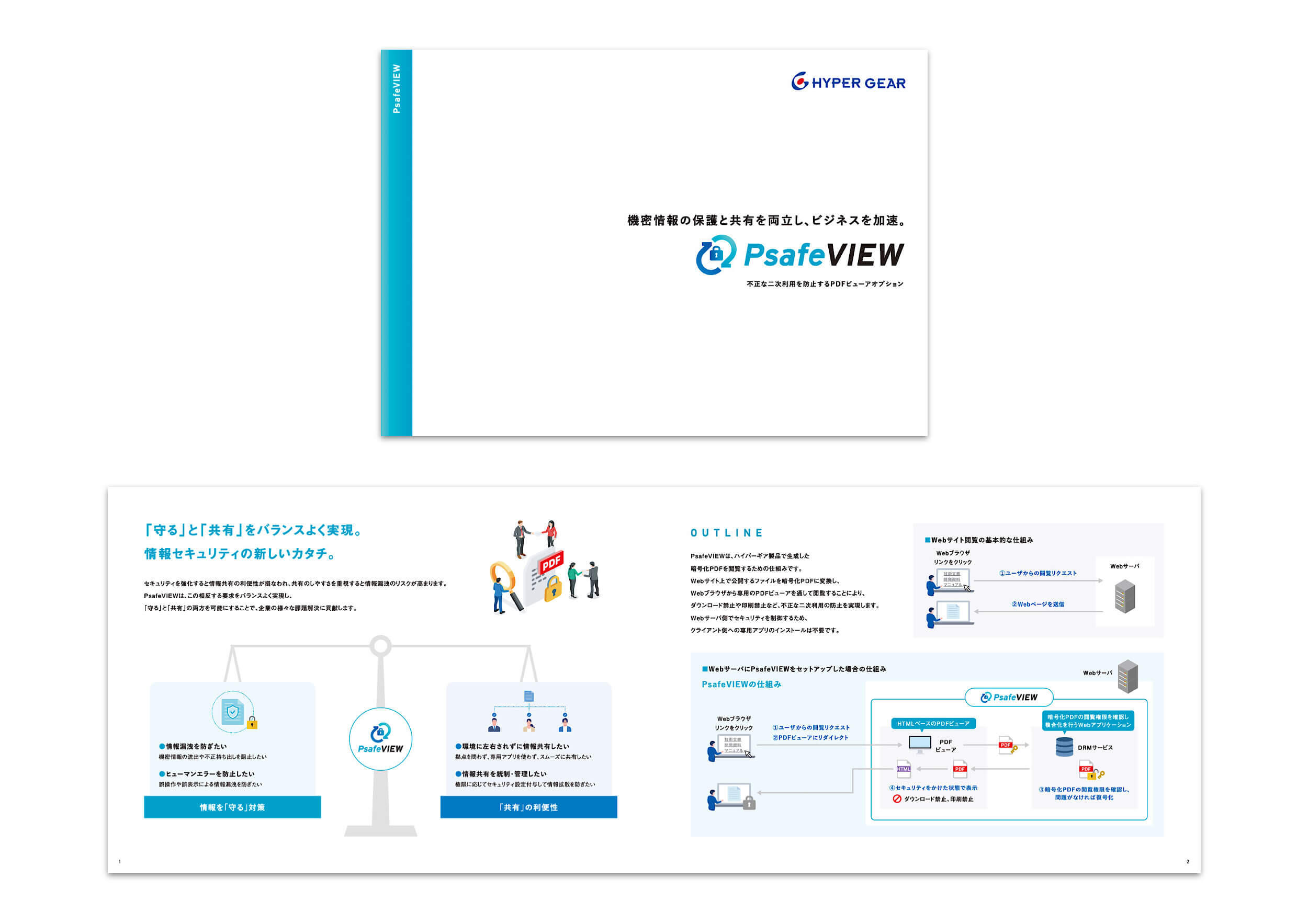 株式会社ハイパーギアの製品カタログ制作実績として、暗号化PDF専用ビューア「PsafeVIEW」をご紹介します。本カタログでは、セキュリティ製品ならではの「守る」と「共有する」という相反する要素をいかに表現するかが大きなテーマでした。
