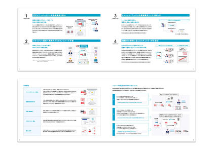 デザイン面では、両立を象徴するアイコンや図解を多用し、複雑な内容を直感的に理解できる構成に。表紙は白を基調としつつ、ロゴカラーであるブルーを差し色にすることで、清潔感と信頼性を印象づけています。展開ページでは、まず力強いキャッチコピーと図解で製品の価値を端的に伝え、その後システム構成や導入イメージを整理したレイアウトを配置。情報量が多くても読み手にストレスを与えず、専門知識を持たないユーザーでも自然にメリットが理解できる流れを設計しました。