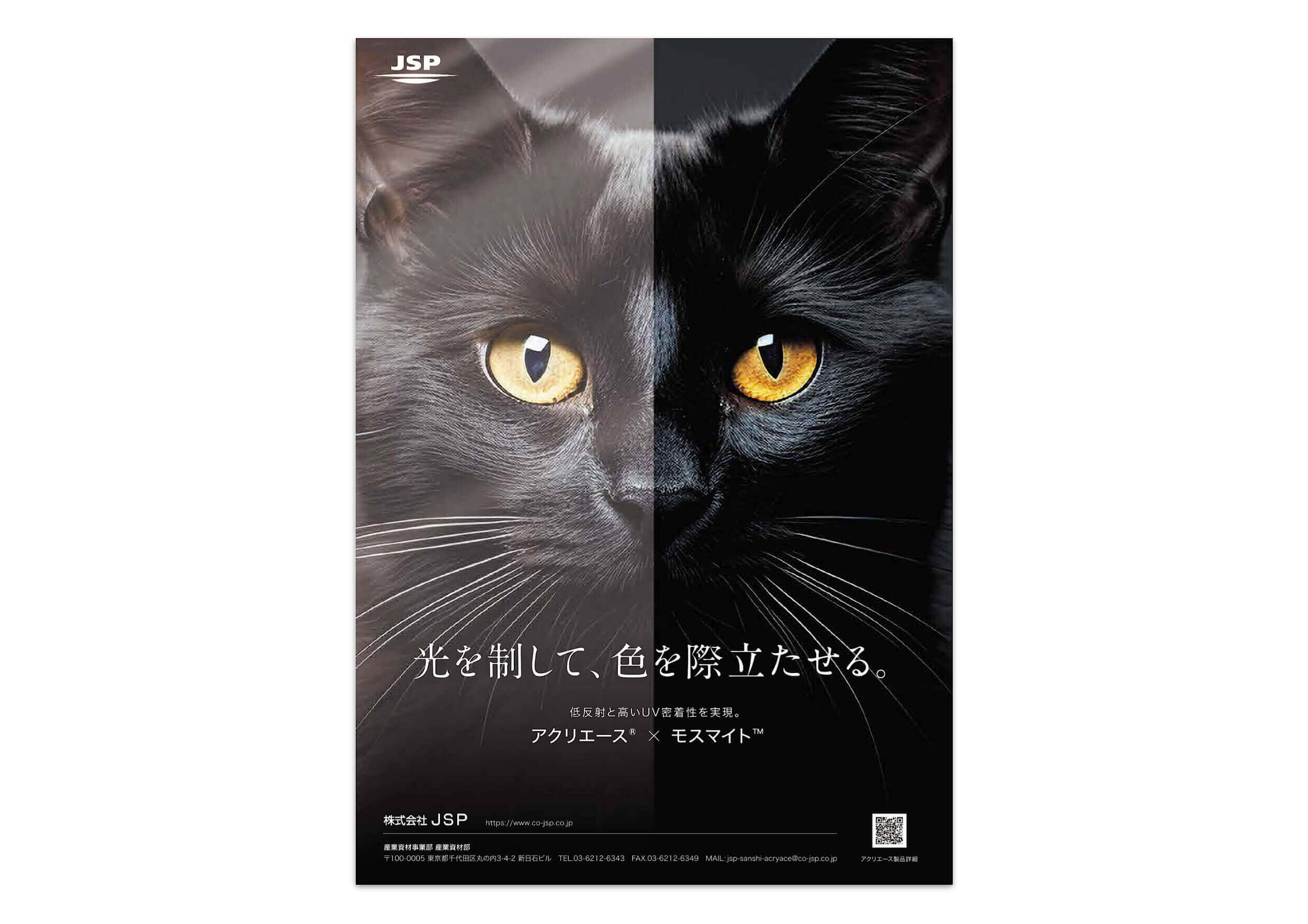 屋外プロモーション専門誌「Signs&Displays」表2に掲載された、JSP新製品「アクリエース」の全面広告をデザインしました。低反射性と圧倒的な透明感という製品の特長を直感的に伝えるため、黒猫写真を左右で比較する大胆な構成を採用。