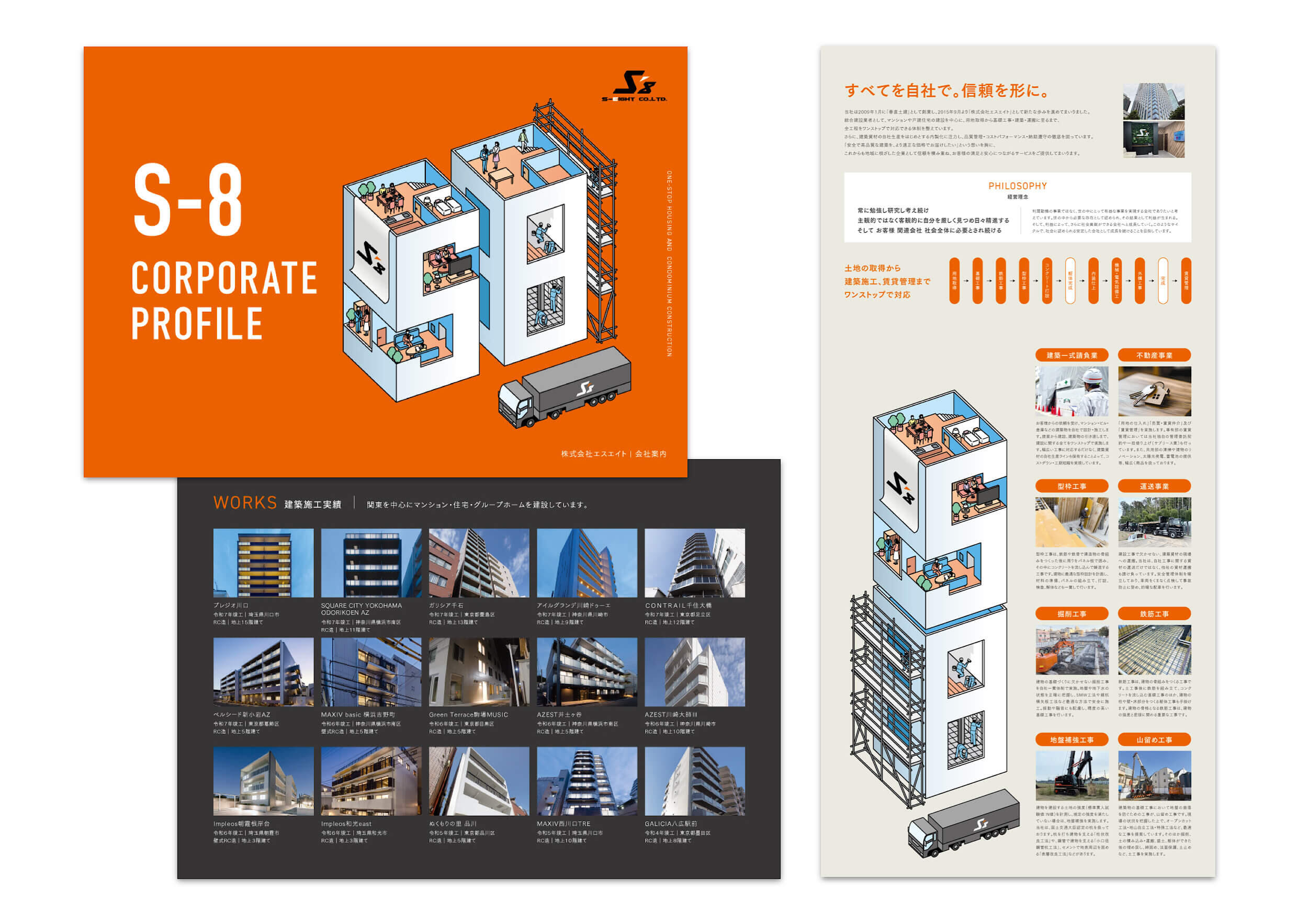 社名である「S-8」を建築物に見立てたイラストとして大胆にビジュアル化し、建築業ならではのスケール感と独自性を直感的に伝える表現を採用。ひと目で社名と事業イメージが結びつく、記憶に残るリーフレットデザインを目指しました。