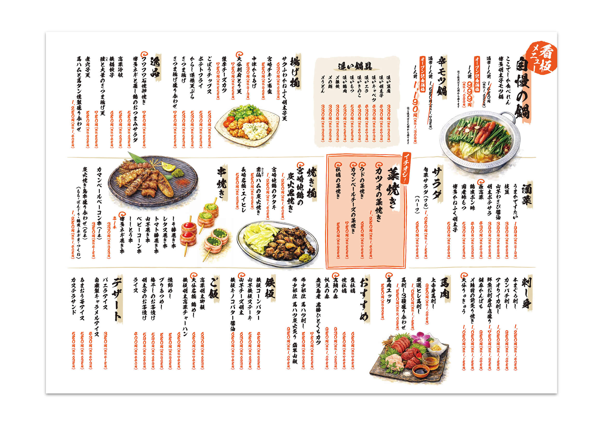 青葉台本店の新規オープンに合わせ、自慢のモツ鍋をメインとしたメニュー表を制作しました。多くのメニューをA3一枚の見開きでデザインすることで、お客様がメニューの全体像を一覧できるようにしました。