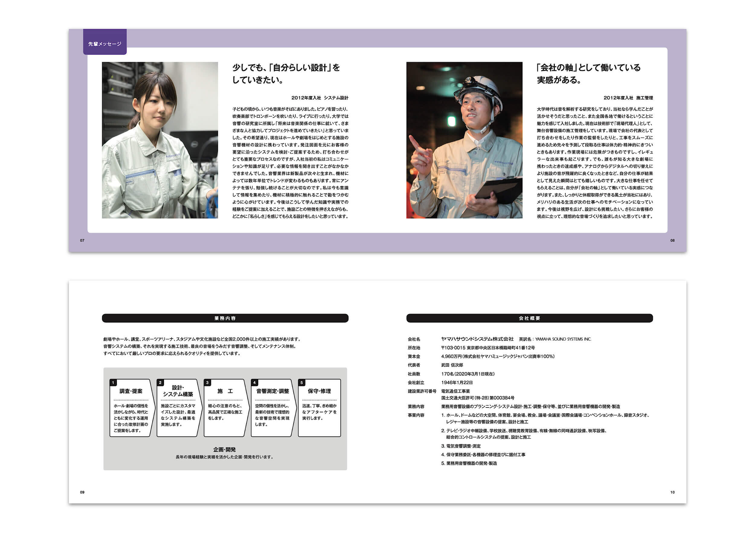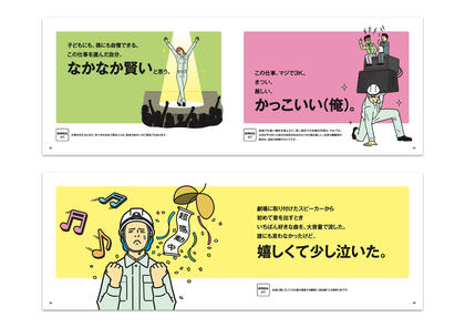 ホールや舞台等の音響設備の提案や施工を行う同社スタッフの募集。ミスマッチを防ぐため、裏方の地道な仕事であることを理解させること、しかしそこに大きなやりがいと喜びがあることをわかりやすく表現することがミッションでした。そこで、「やりがいって、何?」をコンセプトに、仕事のさまざまなシーンをコミカルに見せる採用案内を提案しました。等身大の言葉を使ったコピーとイラストを使い、キャッチーに仕事の面白さを訴求。企業自体にも親しみやすさを感じる採用案内を制作しました。