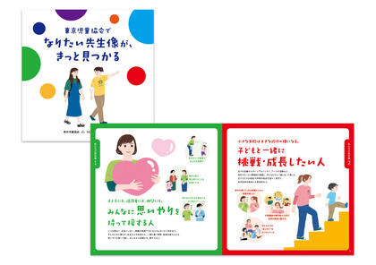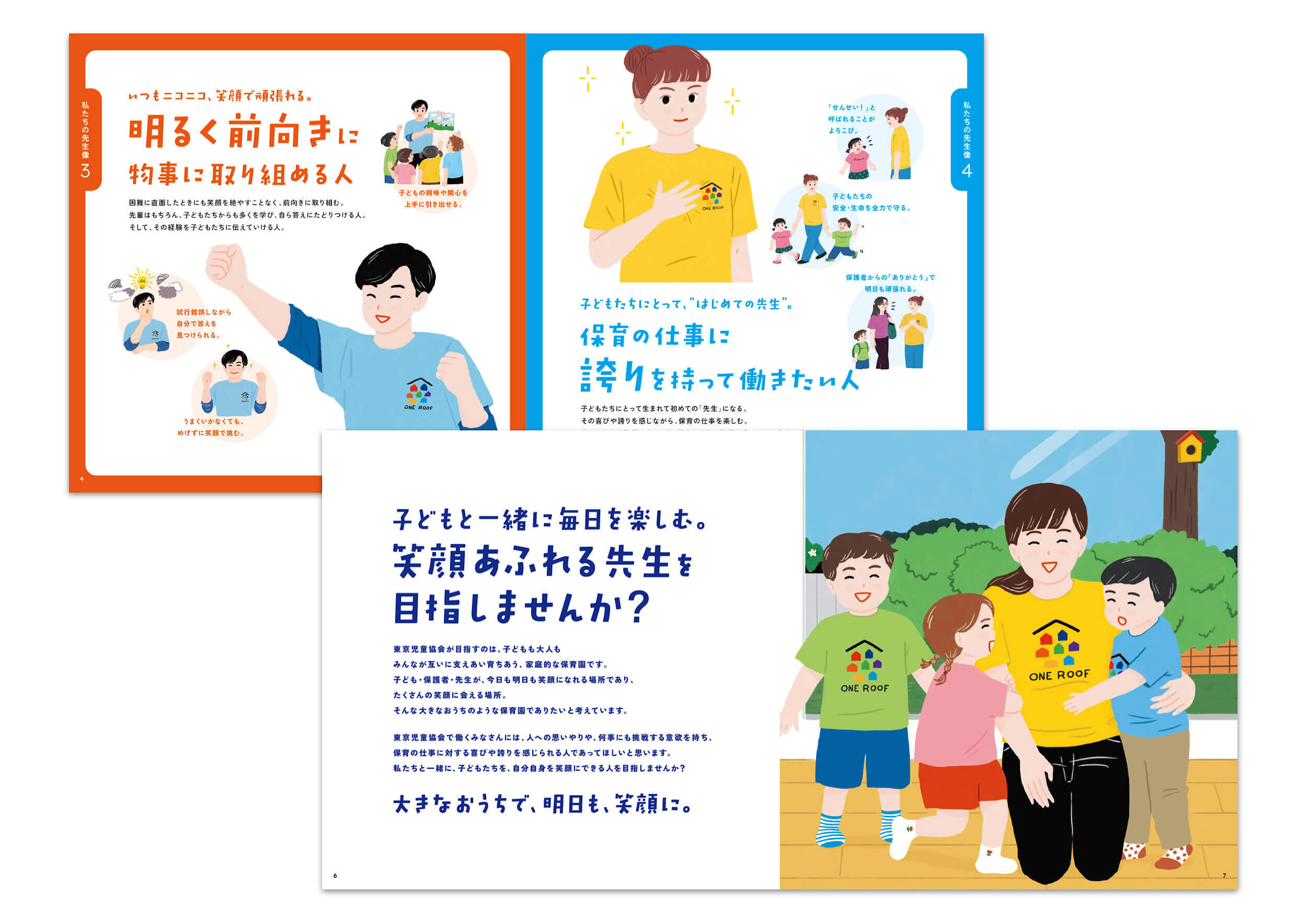 本パンフレットでは、90年以上の歴史を持つ東京児童協会の保育への想いや、デザイン性に富んだ各園舎、新しい取り組みにも積極的な姿勢といった“強み”をわかりやすく表現。特に注力したのが、東京児童協会が大切にする「理想の先生像」の紹介です。学生に「こんな先生になりたい」と思ってもらえるよう、親しみやすいイラストと共に、“共感できる先生像”をいくつもピックアップ。読む人自身の将来像を自然に重ねてもらえるよう設計しました。