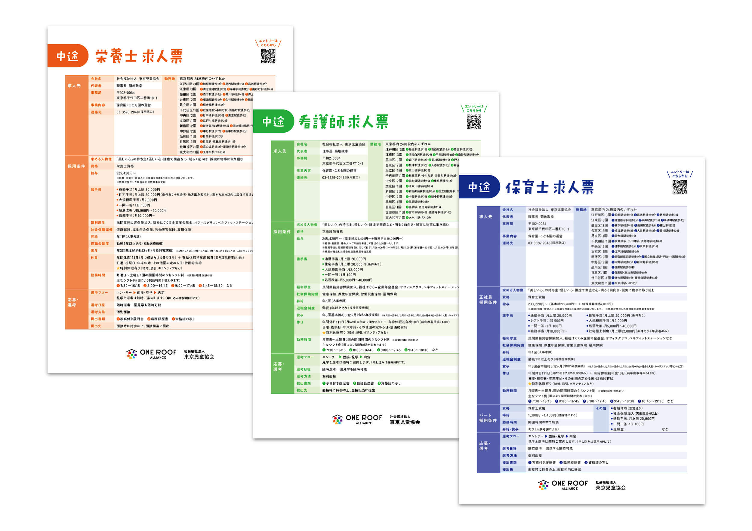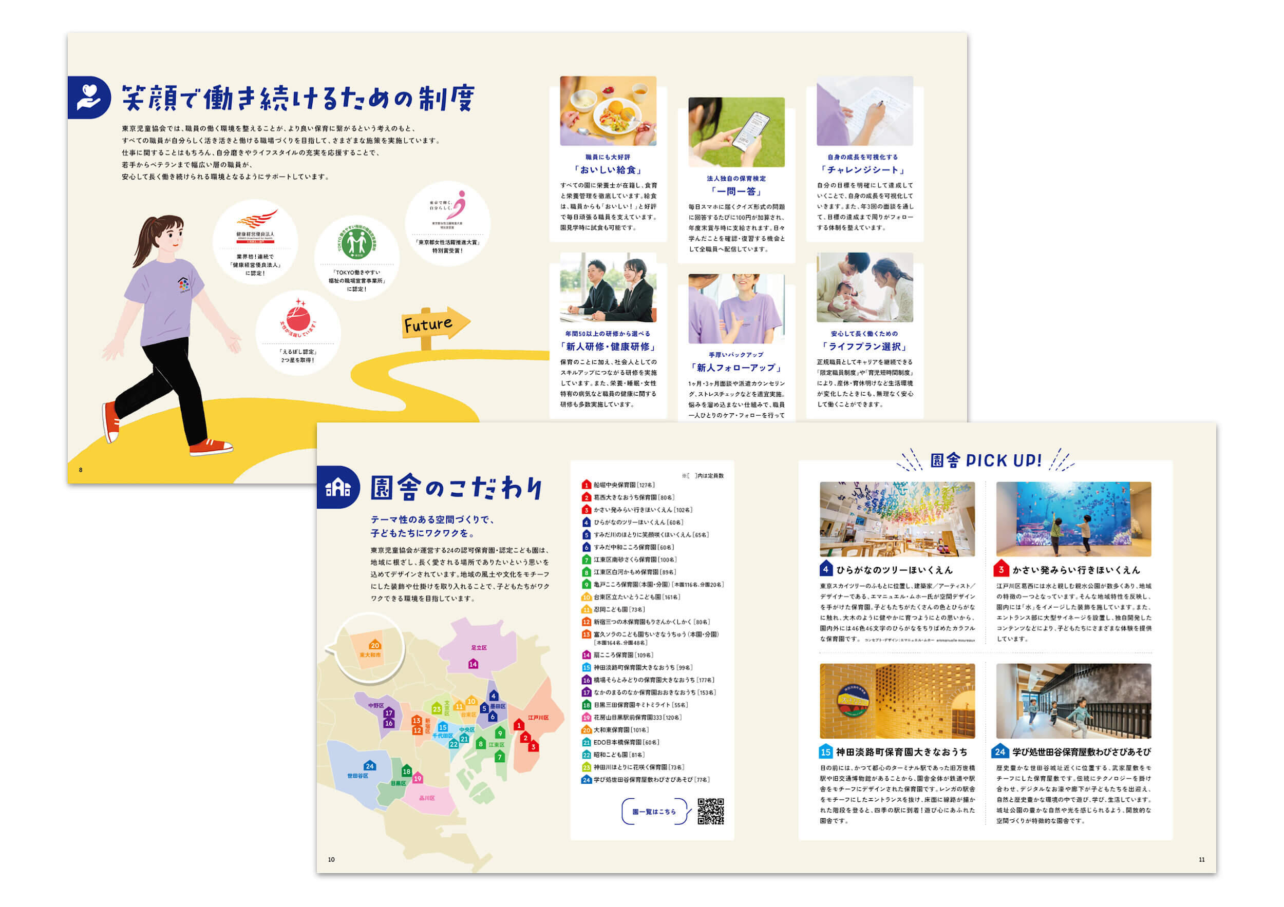 また、具体的な募集要項や勤務条件は求人票にまとめ、パンフレット本誌では理念や職員の思いにフォーカス。東京児童協会の保育がもつぬくもりや誠実さが、読み手の心に届くような構成を心がけました。