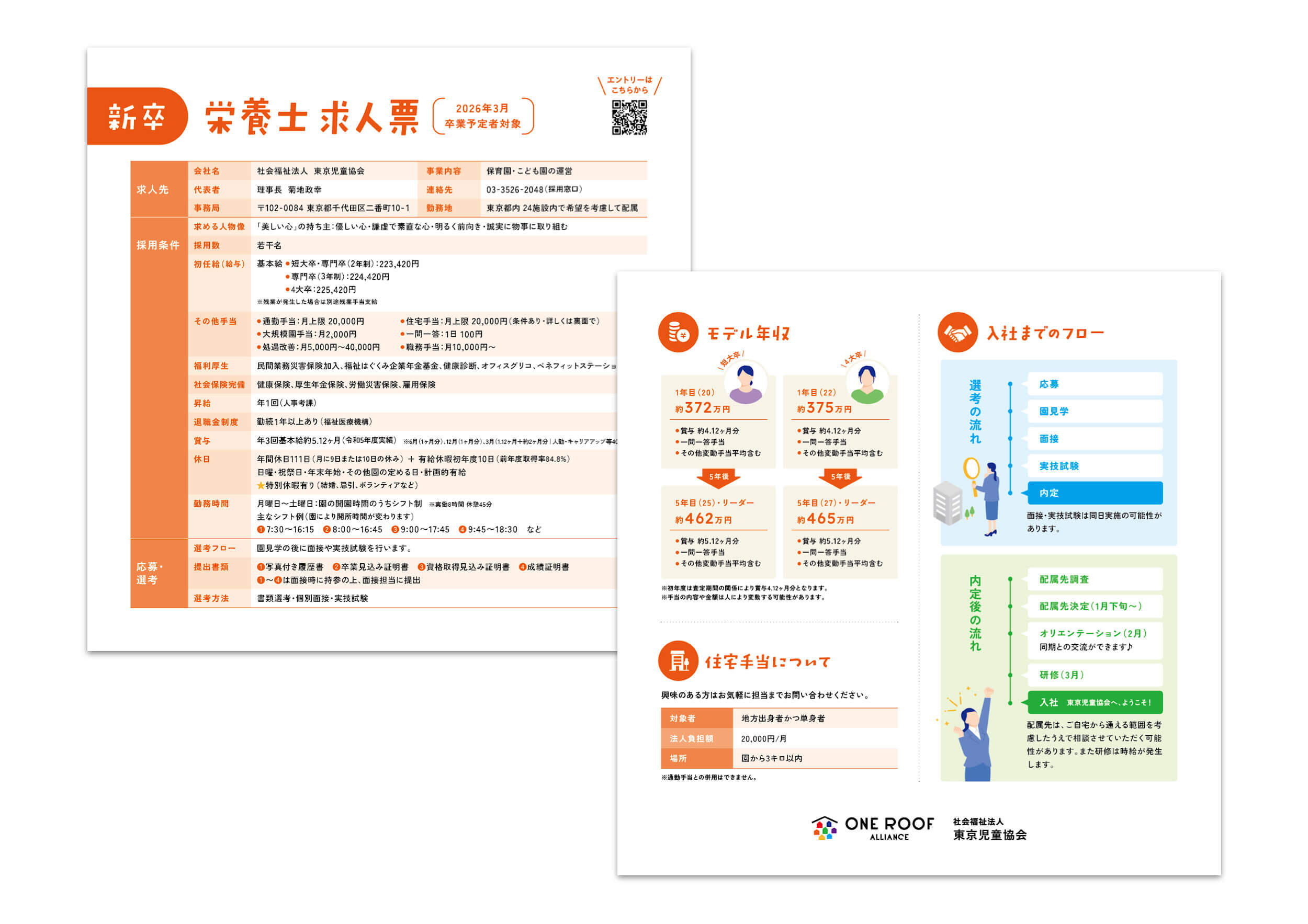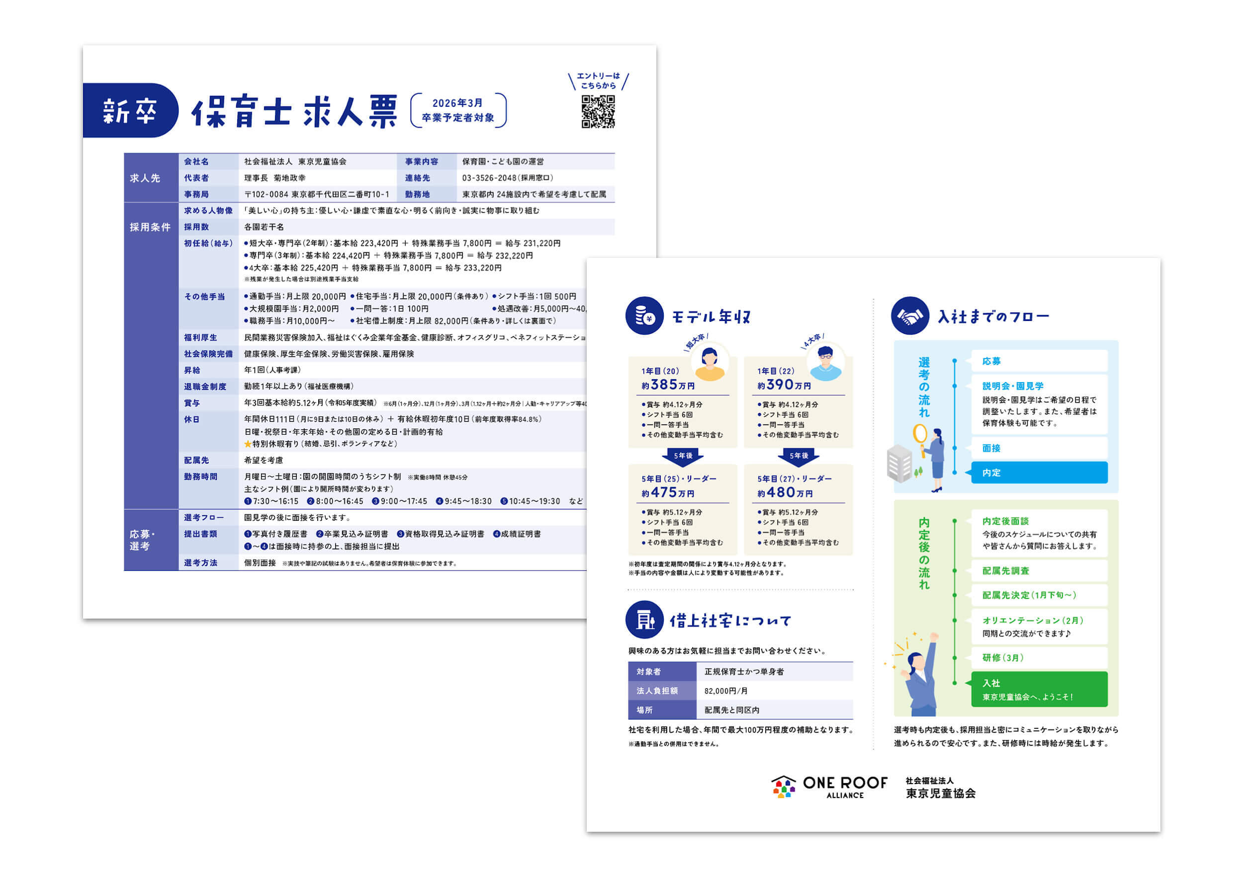 東京都内に24の認可保育園・認定こども園を展開する社会福祉法人 東京児童協会様の採用パンフレットおよび求人票の制作を担当しました。配布先は、採用イベントや保育系養成校、そして園見学に訪れる学生が中心。初めて手に取る方にも親しみを感じてもらえるよう、「明日も、笑顔に。」という採用コンセプトをベースに、興味喚起を目的とした構成に仕上げています。