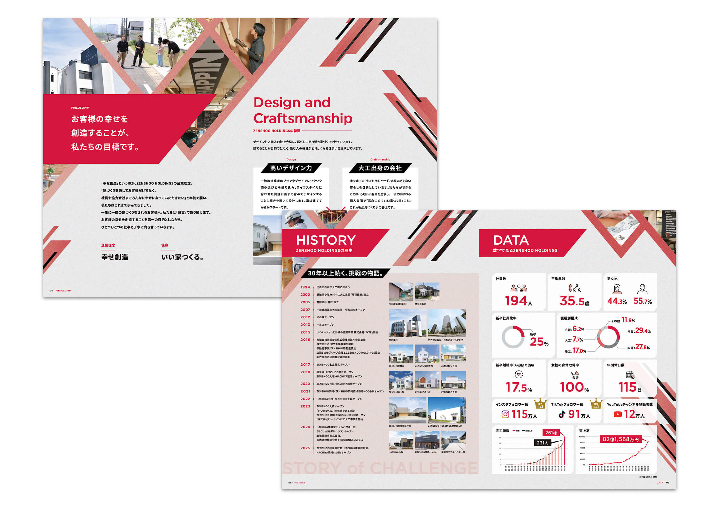 ZENSHOO HOLDINGSの採用案内パンフレットを制作しました。同社は「日本一の地場工務店」を目指し、若手社員が中心となって活躍する勢いのある企業です。新卒採用にも注力しており、先行していた採用サイトに合わせ、パンフレット制作を弊社にご依頼いただきました。採用コピーには「ソノマタムコウヘ」を採用し、企業ビジョンを象徴的に表現。VIデザインの要素を社員写真のフレームとして活用することで、若さとエネルギーを感じさせるビジュアルに。