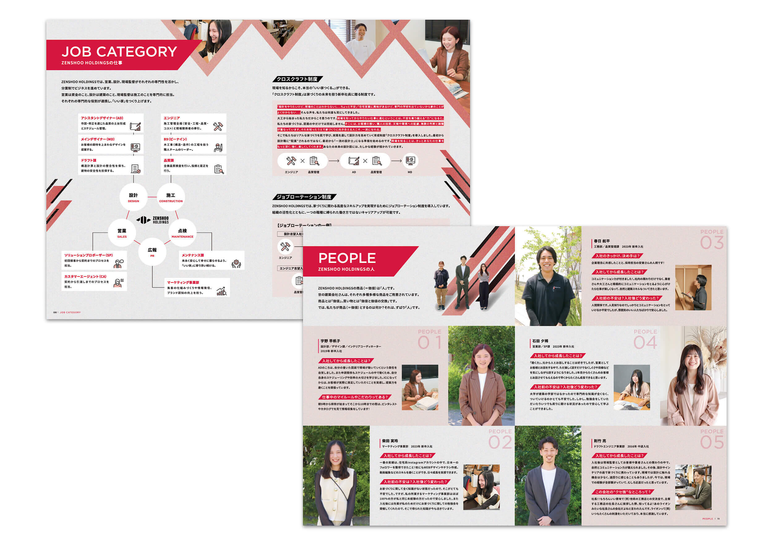 ページ構成は弊社から提案し、企業理念、事業の強み、仕事内容、キャリアステップ、社員紹介、福利厚生などをわかりやすく整理。ZENSHOO HOLDINGSの理念に共感し、共に成長したいと感じてもらえるよう、働く人々の魅力と組織の一体感を伝える内容としました。学生が「この会社で働きたい」と思える採用ツールを目指しました。