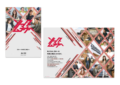 ZENSHOO HOLDINGSの採用案内パンフレットを制作しました。同社は「日本一の地場工務店」を目指し、若手社員が中心となって活躍する勢いのある企業です。新卒採用にも注力しており、先行していた採用サイトに合わせ、パンフレット制作を弊社にご依頼いただきました。採用コピーには「ソノマタムコウヘ」を採用し、企業ビジョンを象徴的に表現。VIデザインの要素を社員写真のフレームとして活用することで、若さとエネルギーを感じさせるビジュアルに。