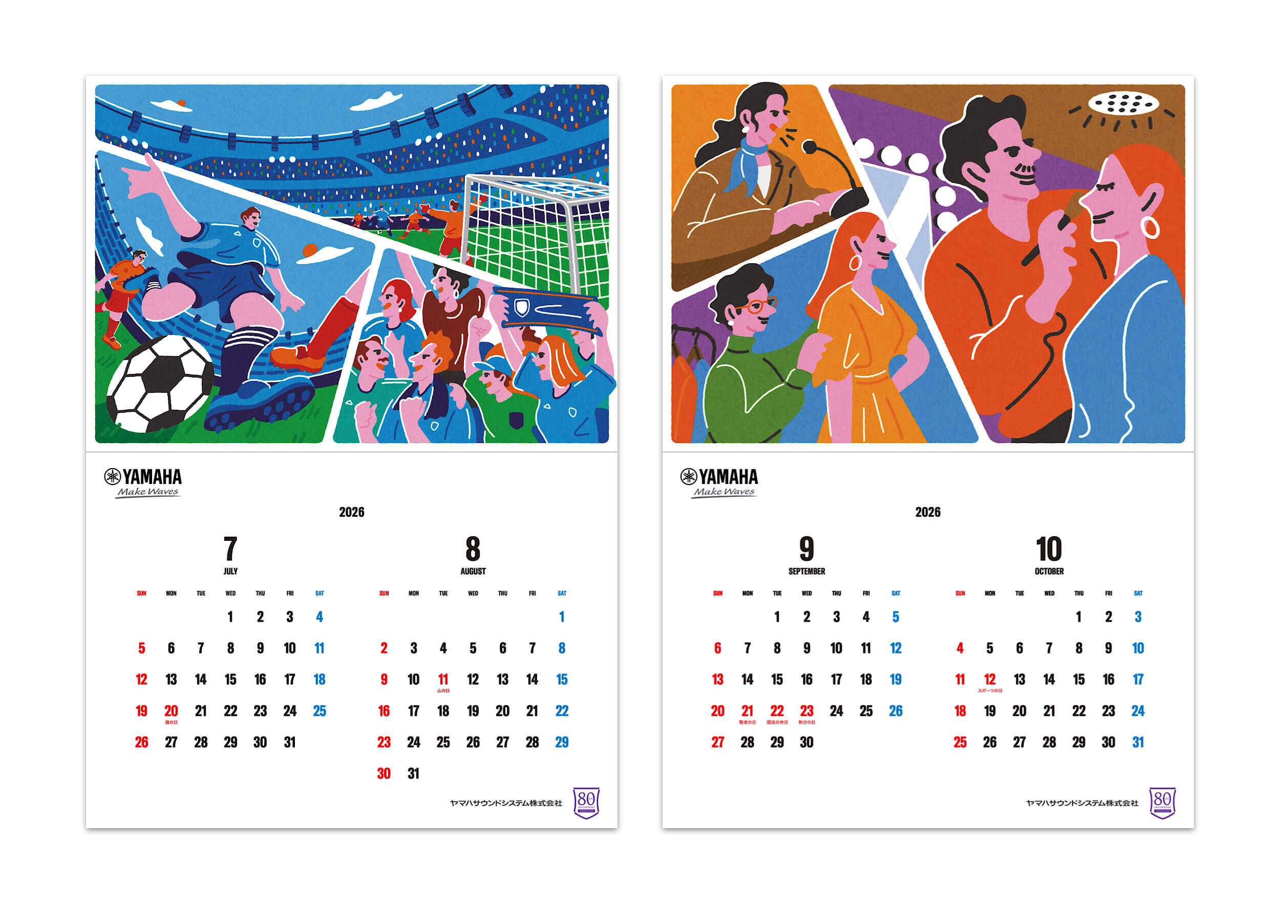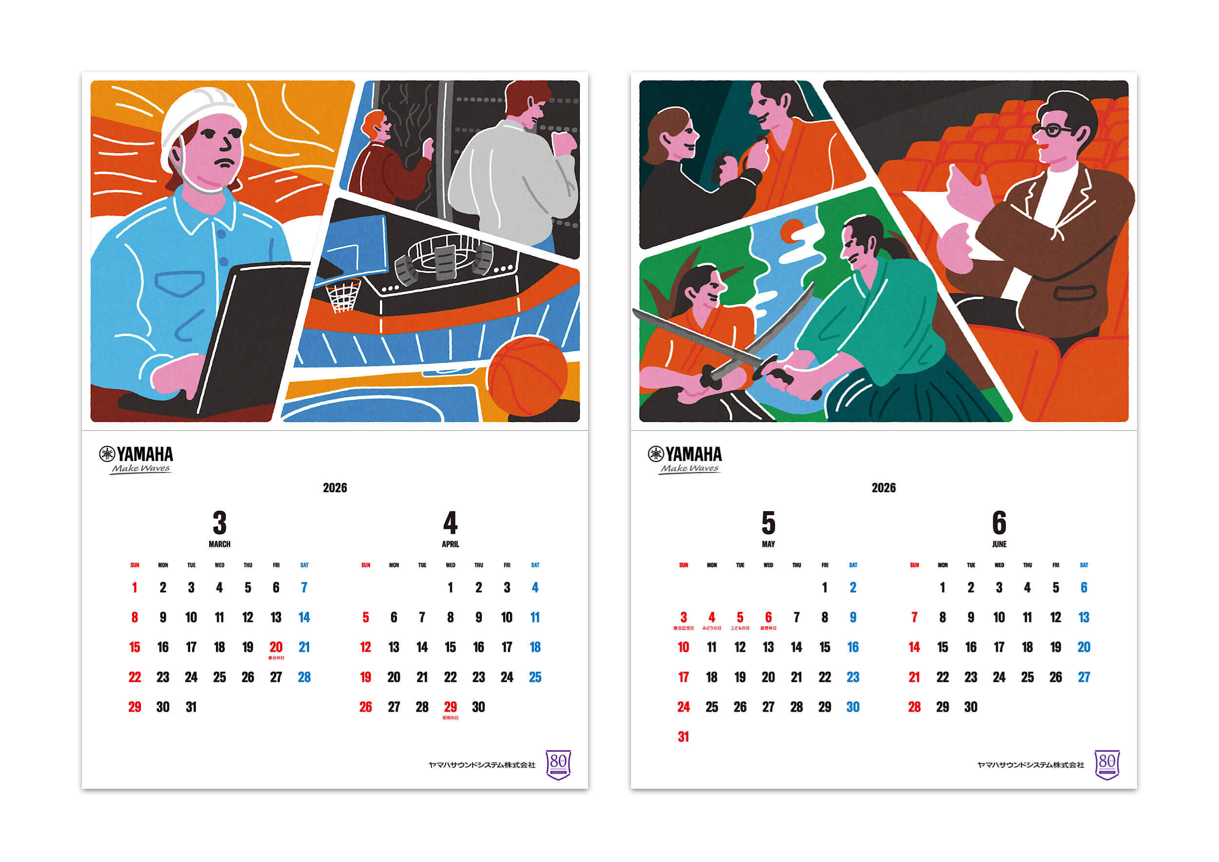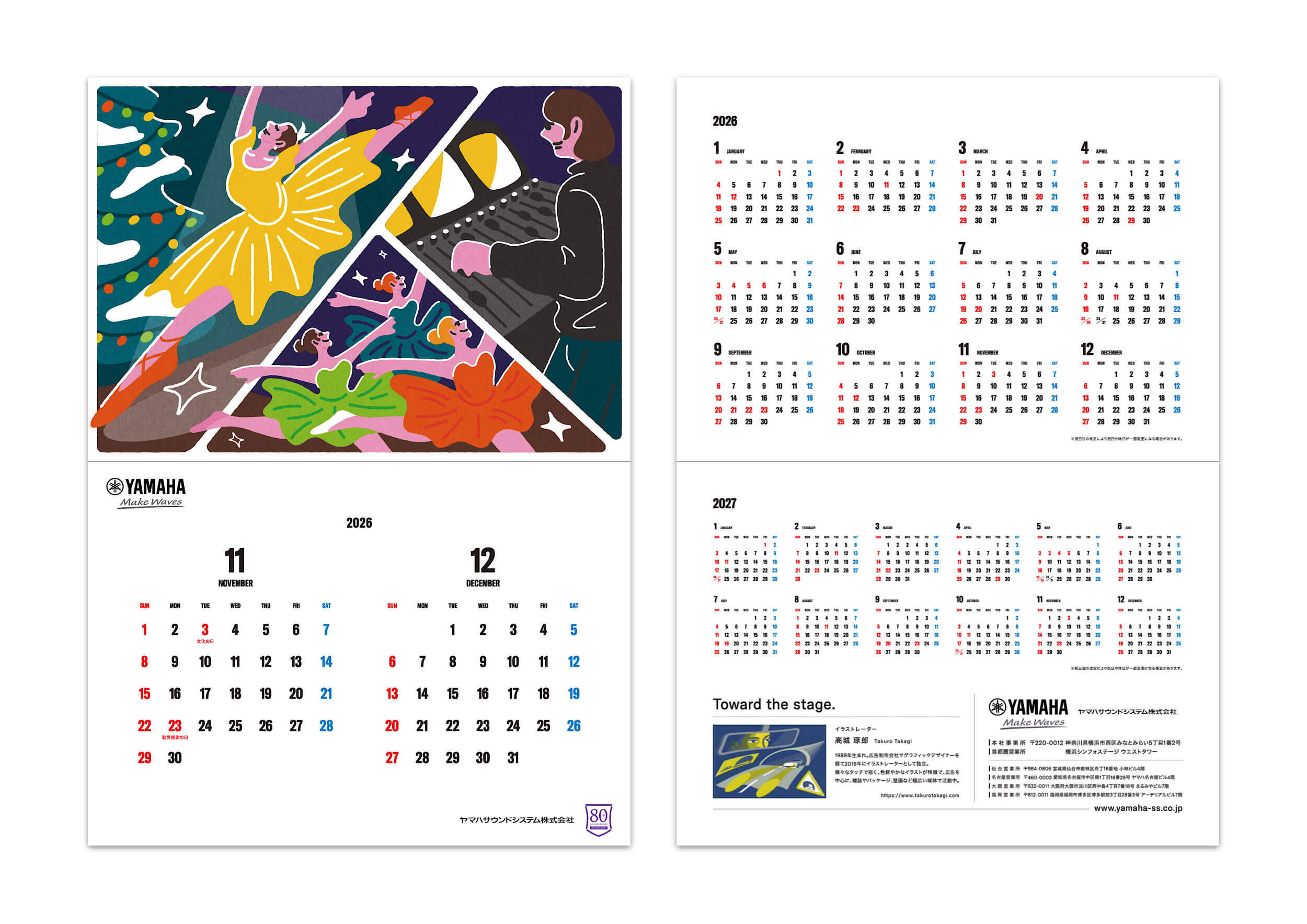 2026年版カレンダーは、「音づくりを支える人々」に焦点を当てたアートワークとして制作しました。ステージの感動を陰で支えるスタッフの姿を、温かく力強いタッチで描写。舞台やイベント、スポーツの熱狂の裏にある努力や情熱を通して、同社が掲げる「感動を・ともに・創る」という理念をビジュアルで表現しました。技術力だけでなく“人”を中心にした企業姿勢を印象づける作品です。