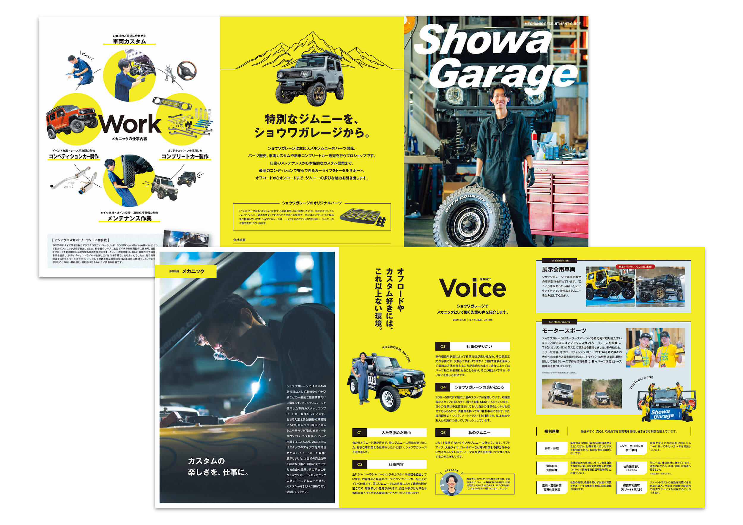スズキ副代理店としてジムニーの整備からカスタム、コンプリートカー製作まで手がけるショウワガレージ様。メカニック採用の課題に対し、応募者の共感を生む採用パンフレットを企画・制作しました。