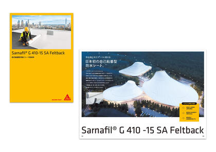 自己粘着層付塩ビシート防水材「Sarnafil G 410 -15 SA Feltback」 の製品パンフレットを制作。屋根のシート防水材を検討する施主・設計事務所・ゼネコンを主なターゲットとした販促ツールです。